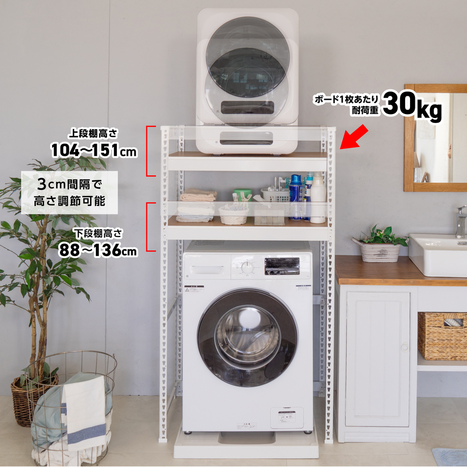 - 「小型乾燥機置き付きランドリーラック」は既存のメタル&ウッドラックシリーズの商品同様に天板高さが3cm間隔で上下調節できるので、